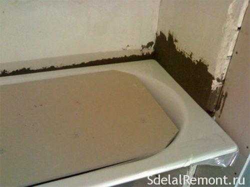 Если щель между ванной и стеной составляет более 0,5 см, её следует предварительно законопатить верёвкой или тканью, вымощенной в жидком цементном растворе.