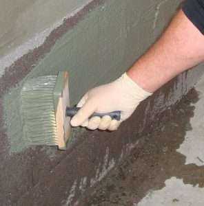 - Смеси для нанесения кистью или пневматическим распылителем. Их наносят на новые бетонные конструкции слоем 1 мм. Так же ими обрабатывают выходящие из стен и пола фундамента коммуникаций (труб водопровода и канализации)