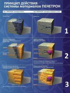 Химически активные вещества «Пенетрона» проникают внутрь бетона независимо от направления давления воды. Движение элементов «Пенетрон» возможно вглубь бетона и против тока воды. Попав внутрь, активные химические элементы «Пенетрона» вступают в реакцию с ионами алюминия, кальция, оксидами и солями металлов. В результате возникает нерастворимый осадок в виде кристаллов, которые и заполняют ячейки бетона, не пропуская воду внутрь. Водонепроницаемость бетона повышается.