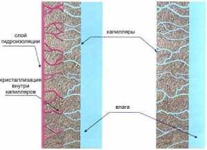 Принцип действия такой изоляции — заполнение микропор в бетоне путем проникания состава вглубь конструкции. Отсюда и появилось ее название — химические элементы, входящие в состав, под воздействием сил адгезии контактируют с поверхностью бетонной конструкции, попадая внутрь.