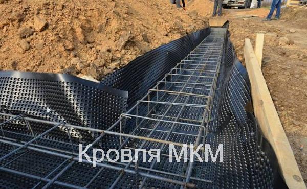 Для наружной стороны фундамента применяют профилированную мембрану, которая имеет способность к равномерному распределению давления по его поверхности