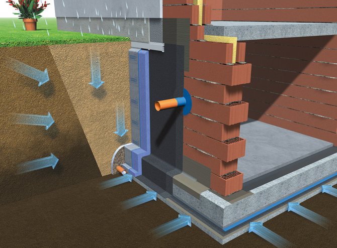 Схема гидроизоляции фундамента с дренажной системой