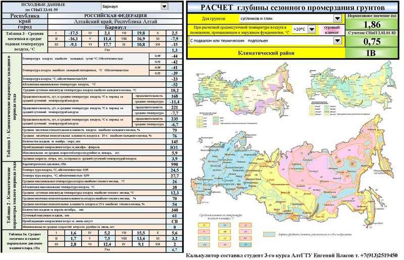 Калькулятор позволит рассчитать нормативную и расчетную глубину промерзания грунта используя новые СП 131.13330.2018 «СНиП 23-01-99* Строительная климатология».
