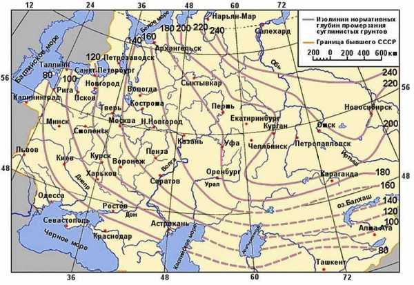 Чтобы примерно определить до какого уровня промерзают грунты в вашем регионе, достаточно взглянуть на расположенную ниже карту.