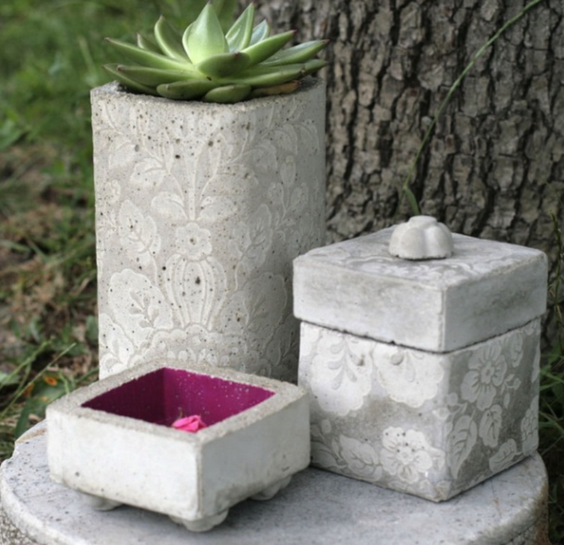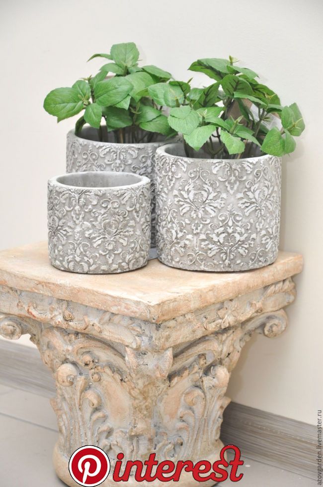 Усилить декоративный эффект может и песок определенного оттенка. Поверхностную отделку выполняют самыми разными способами – методом напыления, трафаретным окрашиванием, штамповкой. Конечно, не все из них можно воплотить в домашних условиях, но простой горшок из бетона легко сделать своими руками, не прибегая к помощи сложных инструментов.