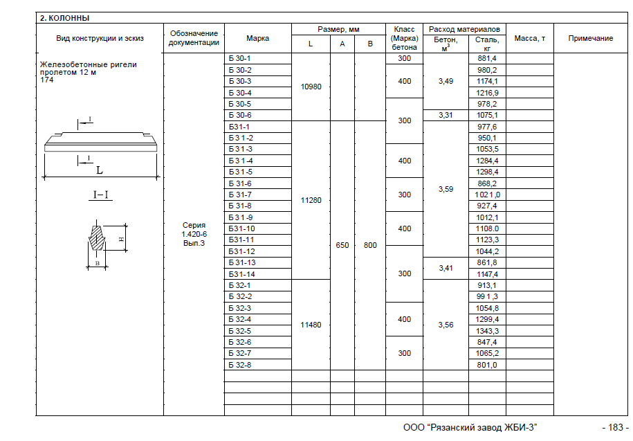 Все железобетонные изделия условно обозначаются марками в соответствии с рабочими чертежами и имеют вид цифробуквенных комбинаций. Марки позволяют легко ориентироваться в номенклатурном ряду готовой продукции, разбираться в технической документации. Маркировка колонны К 11-2 (ГОСТ 27108-86) расшифровывается как: