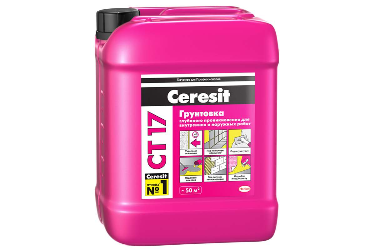 Ceresit CT 17 – концентрированная акриловая грунтовка для бетона на водной основе, которую можно купить отдельно для летних и зимних работ. Отличается хорошими показателями впитываемости, погружаясь в монолит на 5 мм. Церезит подходит для подготовки черновых поверхностей к отделке с применением штукатурных и клеевых растворов, поскольку дает прочный липкий слой. К тому же он неплохо решает проблему слабых и пылящих оснований, буквально склеивая их. Не рекомендуется для использования там, где наружу выходят металлические закладные детали, поскольку вызывает их коррозию, расход – 1,2 л/м2.