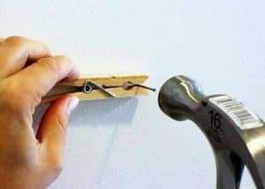 - В качестве фиксатора и подстарховывающего устройства можно взять обыкновенную бельевую прищепку. Ее нужно зафиксировать у основания гвоздя: он получит серьезную опору, а пальцы будут защищены от ударов.