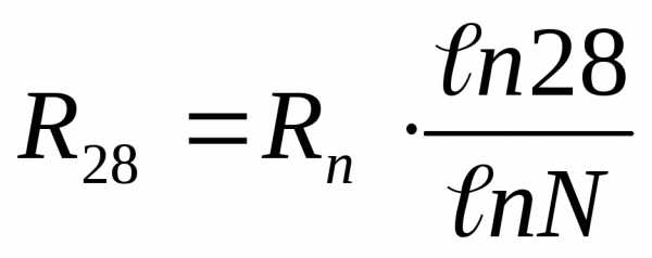 По условиям организации учебного процесса образцы обычно испытывают в возрасте 7 или 14 суток. Для приведения результатов испытания к стандартным 28 суточным используется формула: