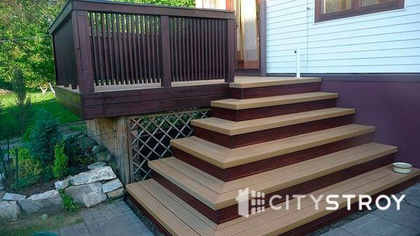 В качестве современной альтернативы лестницам из натурального дерева, в последнее время очень часто используются внешне идентичные, но совершенно другие по своим эксплуатационным характеристикам, лестницы со ступенями из доски ДПК.