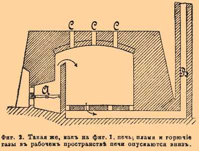 Печь разделена на четыре основных отделения: топку, зольник, обжигальную камеру и трубу. Внутренние размеры такой печи внушительны: 2 м — в ширину и 4 м — в длину. Топка в длину имеет 1 м. За ней установлена стенка с отверстиями, отделяющая топку от обжигальной камеры. После того как обжигательная камера будет загружена черепицей, в задней части камеры выкладывают временную стену с отверстиями. В некоторых печах её не делают, Высота трубы у такой печи не очень большая — около 4,5 м. Размеры трубы внизу — 70×80 см, а в самом верху — 40×53 см. В трубе установлена задвижка для увеличения или уменьшения тяги. Перекрывают печь сводом.