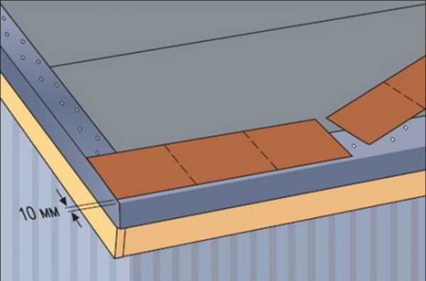 На подготовленную основу по всему периметру закрепляются специальные металлические карнизы, часто называемые капельниками. Они устанавливаются с нахлестом до 50 мм и закрепляются с шагом до 150 мм зигзагообразно. На стыках шаг сокращается до 30 мм.