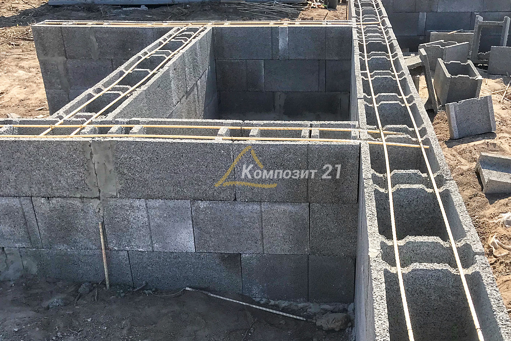 Цоколь выкладывается из фундаментных КББ (керамзитобетонных блоков) с необходимым армированием. Высота цоколя определяется проектом и обычно составляет 4 блока (800мм). Внутренняя часть цоколя утепляется пенополистиролом на всю его высоту.