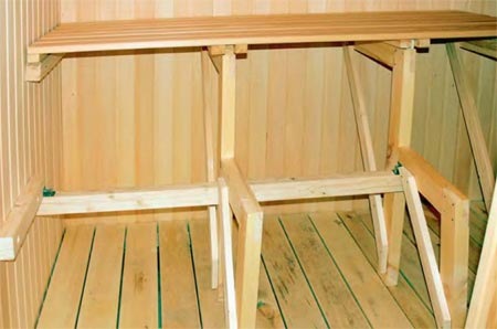 Существует и стационарный вариант расположения полка. При нем полок крепится стационарно, а нижняя скамья является выдвижной.