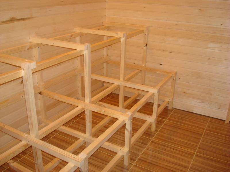 Для изготовления каркаса полков используются строганные бруски хвойных пород дерева (ель, сосна) различного размера – 50×70, 50×50, 50×40, стандартной длины 3м. Монтаж каркаса производится на уже подготовленный пол парной (сауны) – деревянный (половая доска) или плитка (покрытие – обычная полова плитка или керамическая).