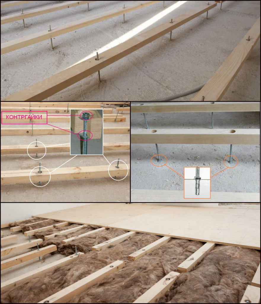 - После этого фанерные листы необходимо закрепить посредством саморезов с пластиковыми дюбелями. Длина саморезов для этой цели должна быть в три раза больше толщины бетонного основания.