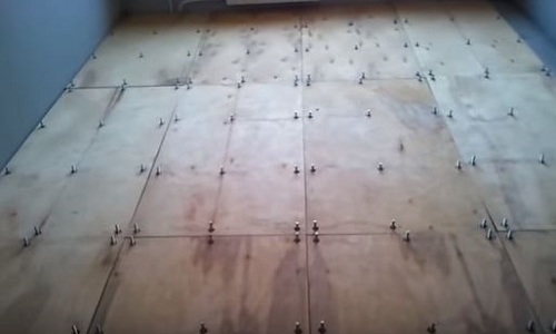 Перед настилом фанерных листов их нужно порезать на квадраты 60х60 см или 75х75 см. Такая процедура способствует созданию множественных швов, что в будущем приведет к регулировке колебаний температурного режима, а также уровня влажности. При монтаже квадратов на бетонное основание нужно следить за тем, чтобы все 4 шва не сходились в одном углу, а были смещены.