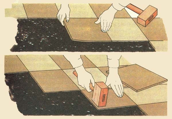 Затем приклеить следующую плитку, слегка поворачивая ее, пока она не ляжет в нужном положении. Таким же образом уложить три или четыре ряда остальной плитки, пока ими не будет покрыта вся поверхность, на которую нанесен клей.