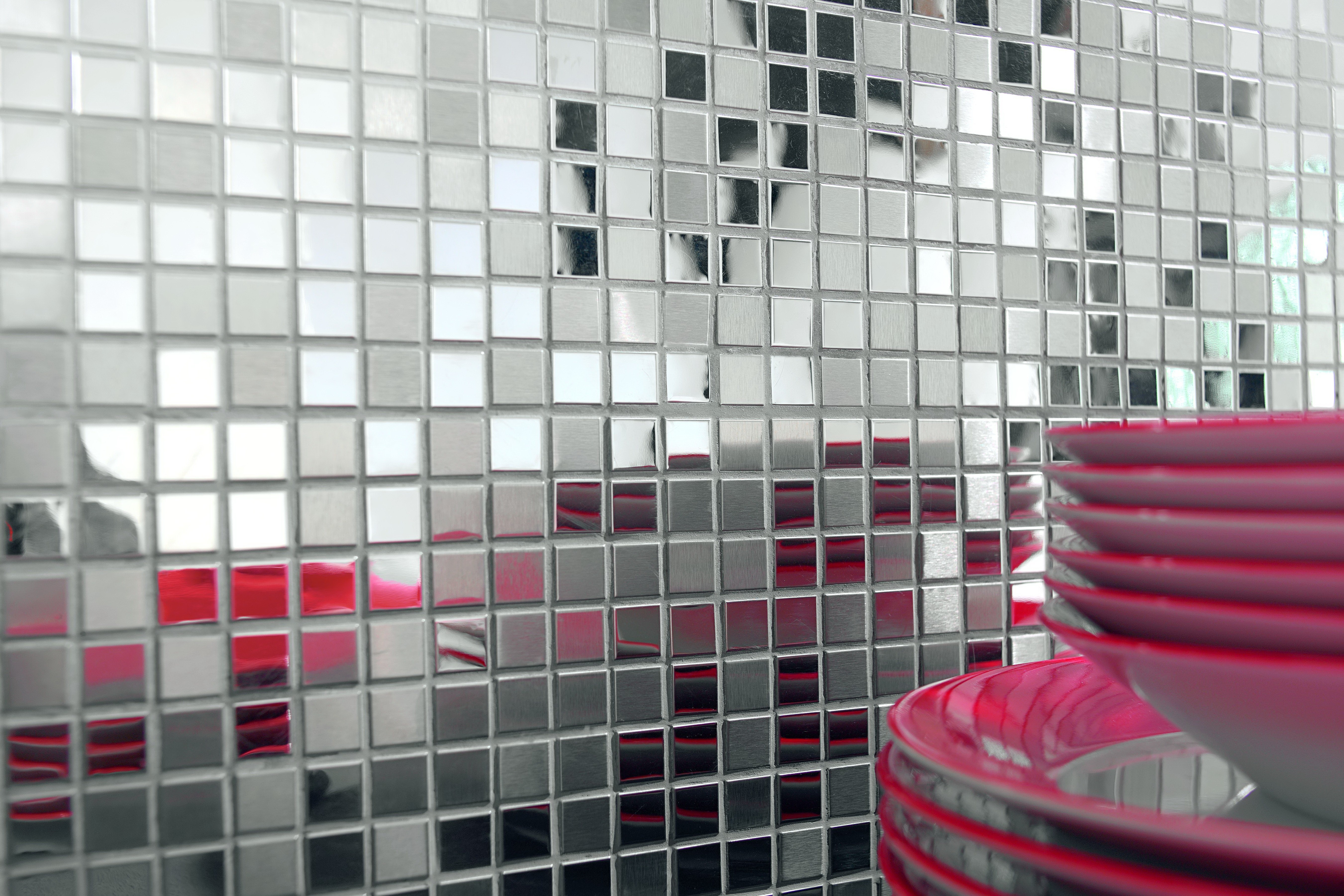 Мало встречающийся вариант – мозаика из металла. Такую плитку используют в качестве дополнения. Производят из резины или керамики, покрывая сверху слоем нержавеющей стали, латуни или бронзы.