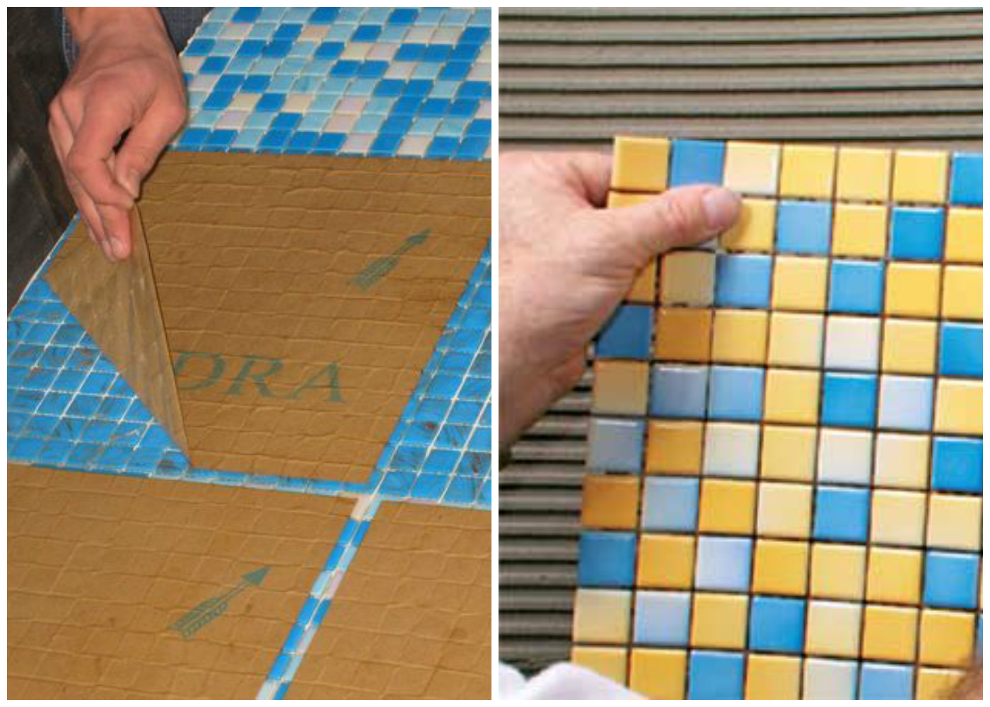 Как уже упоминалось выше, мозаика представляет собой небольшие модули на основе бумаги или сетки. В зависимости от основы применяют разные методы укладки. Разница заключается в том, что работая с плиткой на сетке, мастеру легче контролировать швы между пластинками, что нельзя сказать о бумаге.