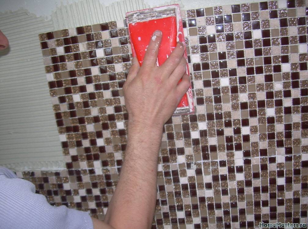 На следующем этапе необходимо прочистить швы от остатков клея с помощью шпателя или отвертки. Далее затереть швы резиновой теркой шириной 15–20 см, а остатки шпаклевки убрать с помощью мокрой губки. После затирки швов мозаику необходимо очистить и отполировать поверхность.
