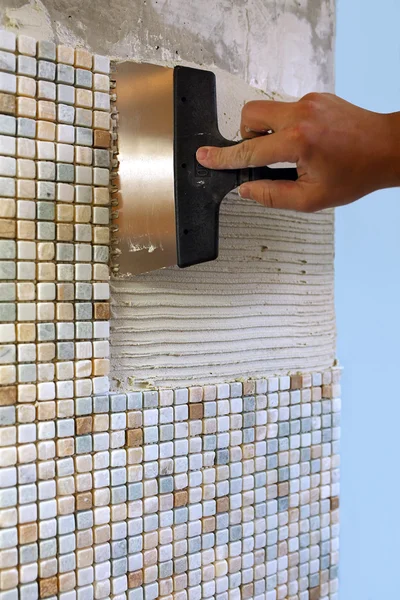 Технология укладки мозаичной плитки на бумаге и на сеткеКлей равномерно наносят на подготовленное основание гладким шпателем, затем дублируют слой зубчатым. Не нужно сразу наносить смесь на большие участки, потому что клей может подсохнуть и мозаика плохо приклеится. Для работы лучше всего использовать зубчатый шпатель на 3-4 мм или на 6-8 мм, тогда борозды получаются не глубокими, а плитка ложится идеально ровно.