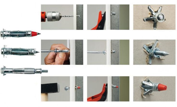 Существует несколько типов дюбелей, позволяющих крепить навесные конструкции к ГКЛ: