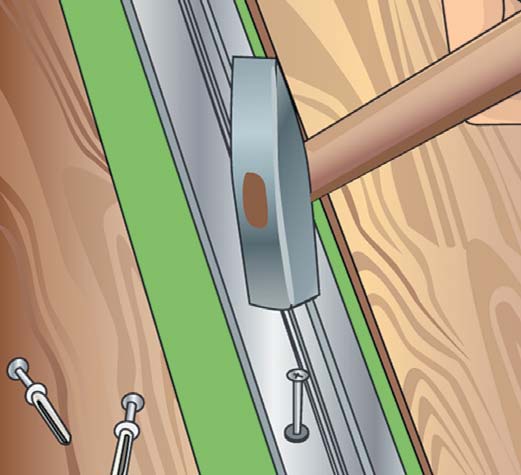 - Боковые «крылышки» сжимаются рукой, после чего крепежный элемент вставляется в отверстие. Он должен входить туго, поэтому для осадки рекомендуют использовать молоток. При этом насечки на корпусе дюбеля должны вонзиться в гипсокартон с лицевой стороны. Это предотвратит прокручивание элемента.
