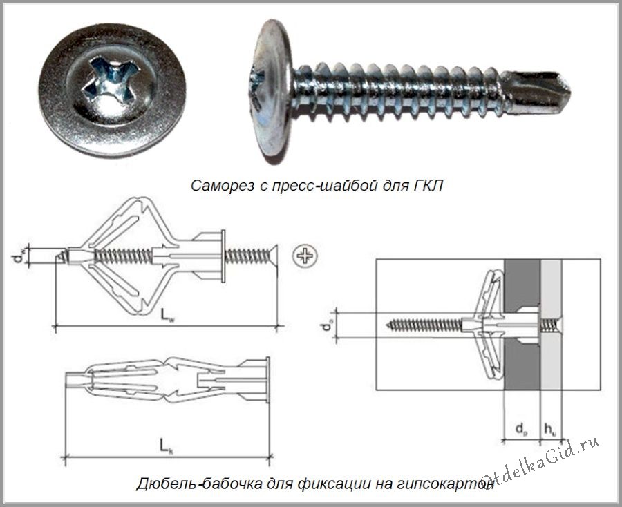 Данный крепеж применяется во многих ремонтных и строительных работах. Для гипсокартона есть некоторые виды, которые создадут прочность фиксирования, при этом поверхность останется первозданной.