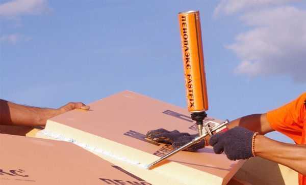 Клеить пеноплекс между собой можно при помощи специальных клеевых составов, представленных в виде пены. Клей используется аналогично, как и пена на полиуретановой основе. Высокая адгезия материала позволяет фиксировать пеноплекс на гладких бетонных и каменных поверхностях.