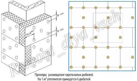 Дюбели с широкими шляпками применяют при наружной теплоизоляции стен. Процесс трудоемкий, плита прибивается по углам и в центре. - Комбинированным способом.