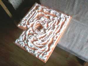 - нанести зубчатым шпателем готовый раствор на плиту, отступая от кромок на 2 см;