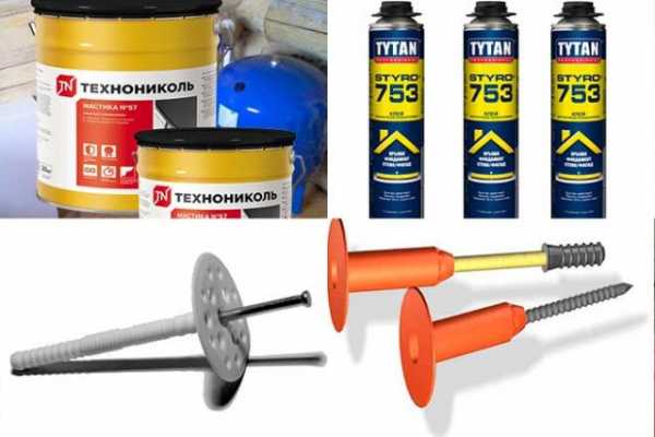 Нужно правильно подобрать вяжущее вещество. Применяют цементные сухие смеси, битумные и полимерные мастики, жидкие составы, полиуретановый клей — он хорошо прикрепляет не только пеноплекс, но и пенопласт. - Метизами.