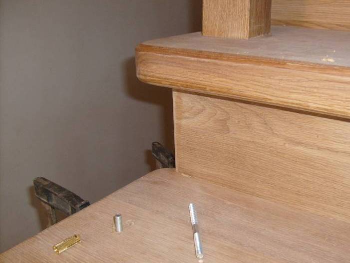 Торцы ступеней пропитывается клеем, им же промазывается внутренняя поверхность прорези на одной тетиве. Ступень вставляется в паз и прижимается. Так поступают со всеми ступенями, затем, то же действие производят с другой тетивой. После высыхания клея для более надежной фиксации соединение дублируют шурупами. Шляпки заглубляют на 5-7 мм и потом декорируют либо заглушками, либо шпаклевкой. Еще один вариант крепления ступеней – это на металлические уголки, накладки или на изогнутые фигурно опоры. Тогда углубления на тетивах делают для них и фиксируют саморезами.