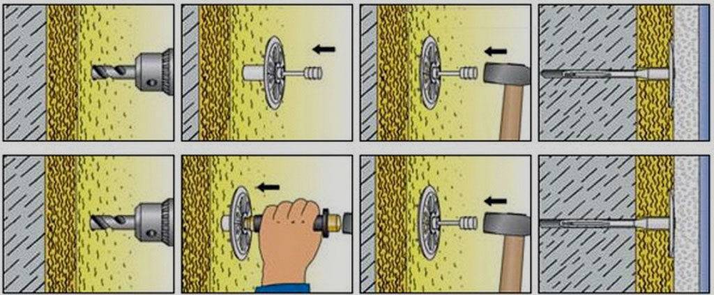 На специальные дюбеля, которые внешне напоминают грибки со шляпкой, крепят все виды утеплителей начиная от пенопласта и заканчивая минеральной ватой. Например, плиту из пенопласта, сначала крепят к стене клеем, а после фиксируют с помощью нескольких зонтов.