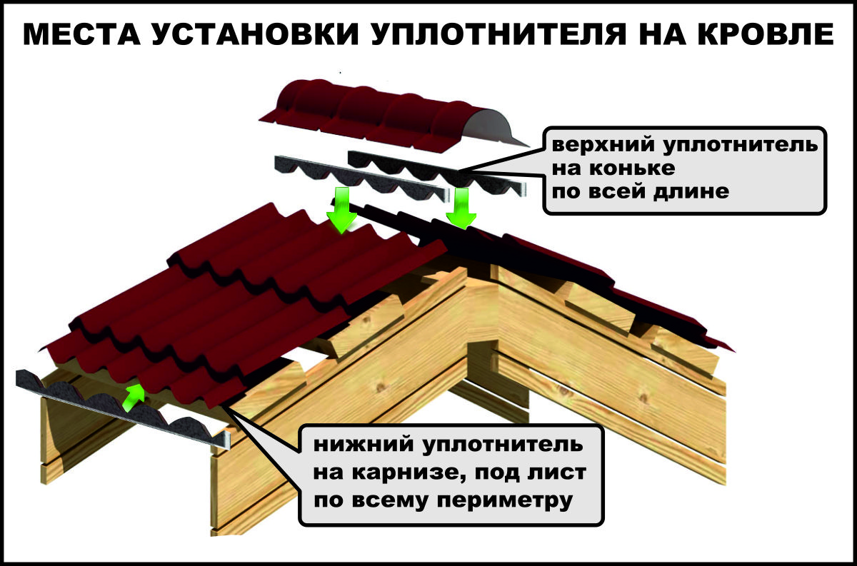 Финальным этапом в работе над монтажом металлочерепицы является монтаж конька. Специалисты советуют располагать под коньком уплотнитель, прикрепленный к обрешетке гвоздями или саморезами. Сам конек должен укрепляться саморезами с шагом через волну.