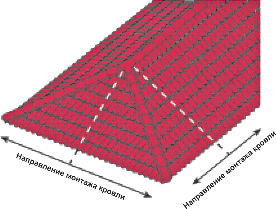 Монтаж выполняется ендовой на стыке лучей. Нижний ендов устанавливается поверх обрешетки Карнизная планка, а верхний ендов – листовой металл поверх волны. Монтаж водосточной системы (трубы, желоба и крюки) должен производиться в соответствии с указаниями производителя системы. Примечание: крюки для крепления желобов необходимо устанавливать на обрешетку до монтажа листового металла.