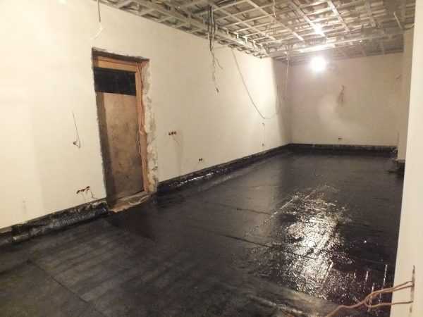 - Следующий шаг – гидроизоляция поверхности. Полы в комнатах, где риск протечки высок (ванная, туалет, кухня), изолируют полностью, создавая своего рода водонепроницаему