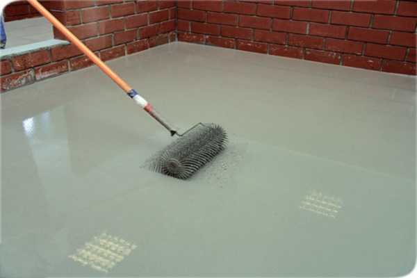 - Готовый раствор выливается на пол и распределяется. Удобно использовать для этой цели игольчатый валик, который ещё и удаляет пузырьки воздуха из раствора. Когда пол будет равномерно залит и обработан валиком, его оставляют для высыхания, которое происходит буквально за двое – трое суток.