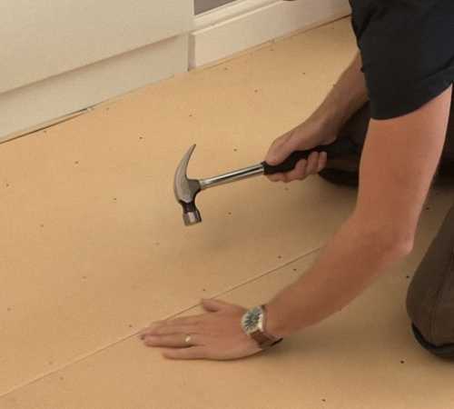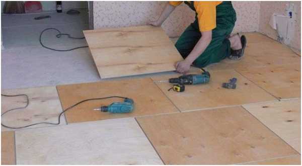 - Фанерные листы раскладываются на пол так, как они должны лежать в готовом виде. Фиксировать их можно дюбель-гвоздями или саморезами.