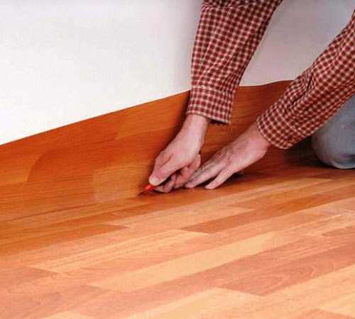 - с помощью острого канцелярского ножа обрежьте излишки линолеума, отступая от стены один сантиметр;