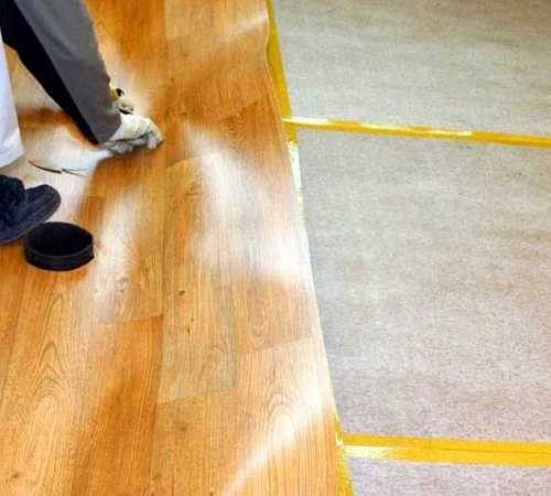 - Материал при укладке на пол нужно очень хорошо прижимать к основанию. Отдельно проводится проклейка стыков и краев линолеума.