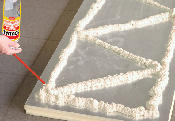 Экструдированный пенополистирол, в отличие от формованного (пенопласта), обладает однородной структурой и гладкой поверхностью. Поэтому его склеивание между собой или монтаж к стенам вызывает определенные проблемы, ввиду низкой адгезии. Для решения этой задачи производители строительной химии придумали специальную пенополиуретановую клей-пену.