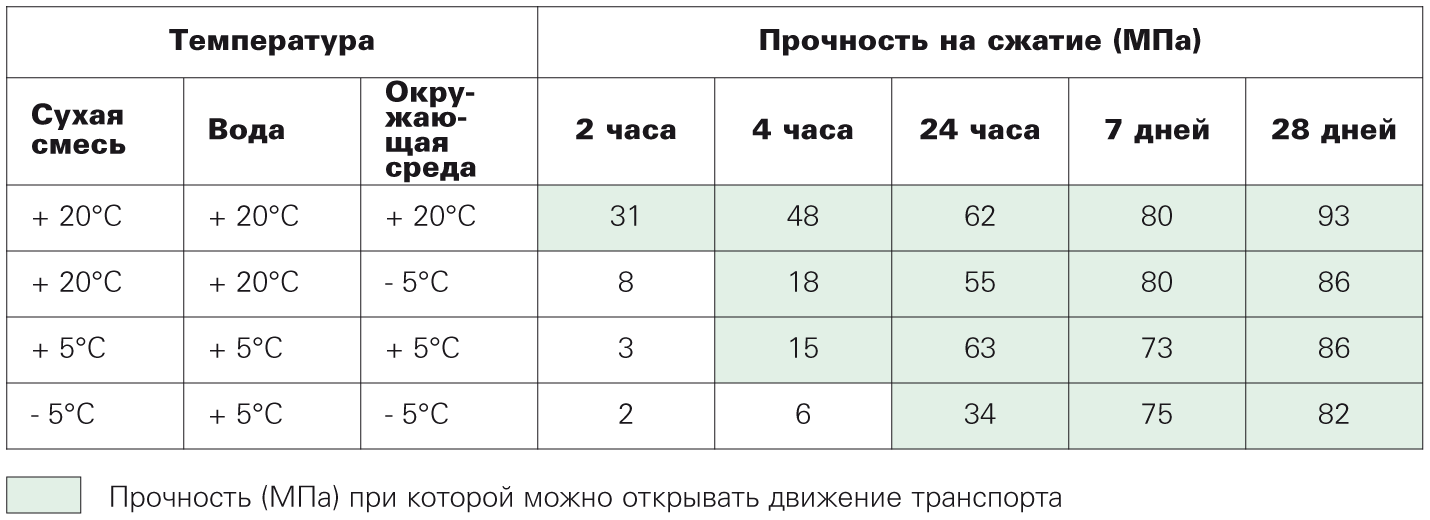 Через три роки показник може вдвічі перевищити значення, отримане через 28 днів після заливки. Спеціальна довідкова таблиця дозволяє дізнатися, який відсоток від марочного значення набере складу при певній температурі через певну кількість днів.