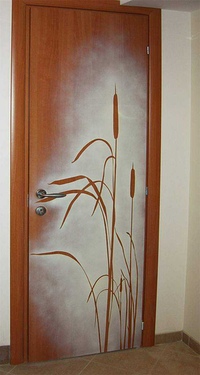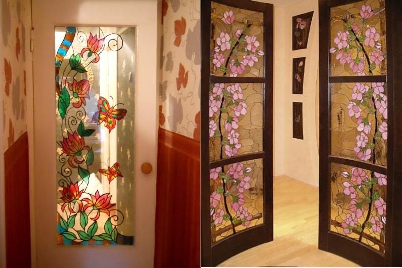 - Витраж или пескоструйное украшение. Если ваша дверь имеет стеклянные элементы декора, освежить их можно с помощью техники витражного оформления.