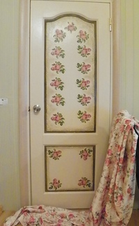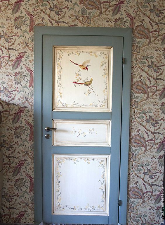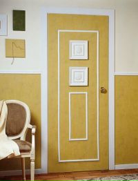 Покраска двери — самое эффективное и долговечное обновление. Принцип подготовки двери к покраске тот же, что и при оклеивании обоями или тканью: дверь необходимо снять с петель, очистить, обезжирить растворителем и отшлифовать. Проводить покраску необходимо в проветриваемом помещении. Покраска двери — процесс длительный, требующий нанесения нескольких слоев краски и высыхания. Если вы выбираете однотонную краску, можете наклеить на дверь красивые наклейки. При покраски двери используйте фантазию и создайте красивый рисунок. Рисунок можно создать с помощью трафарета. Краска может быть с имитацией сложной текстуры: под старину, джинсу, бархат, дерево. Если у вас талант художника, из старенькой двери вы можете создать настоящий шедевр.