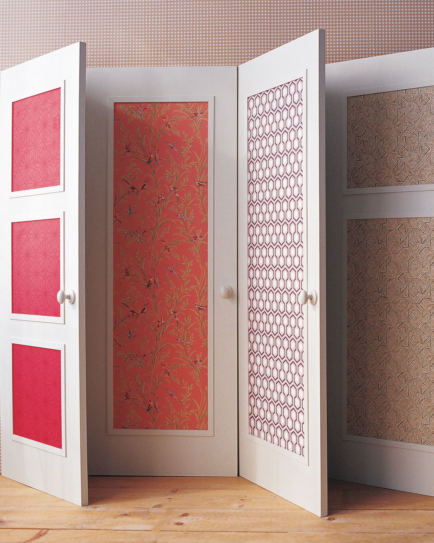 Технология поклейки мало чем отличается от обычной, дверное полотно грунтуют, затем промазывают клеем и прикладывают лист обоев. С помощью декоративных фризов можно подчеркнуть контуры двери и её элементов, создать интересную композицию. Также можно использовать декоративные стразы или тонкий канат. Следует учесть, что вариант с отделкой обоями лучше использовать для помещений с нормальными показателями влажности.