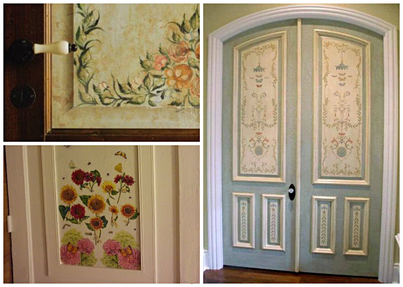 Вариант отделки дверного полона своими руками при помощи виниловых наклеек и фотообоев.