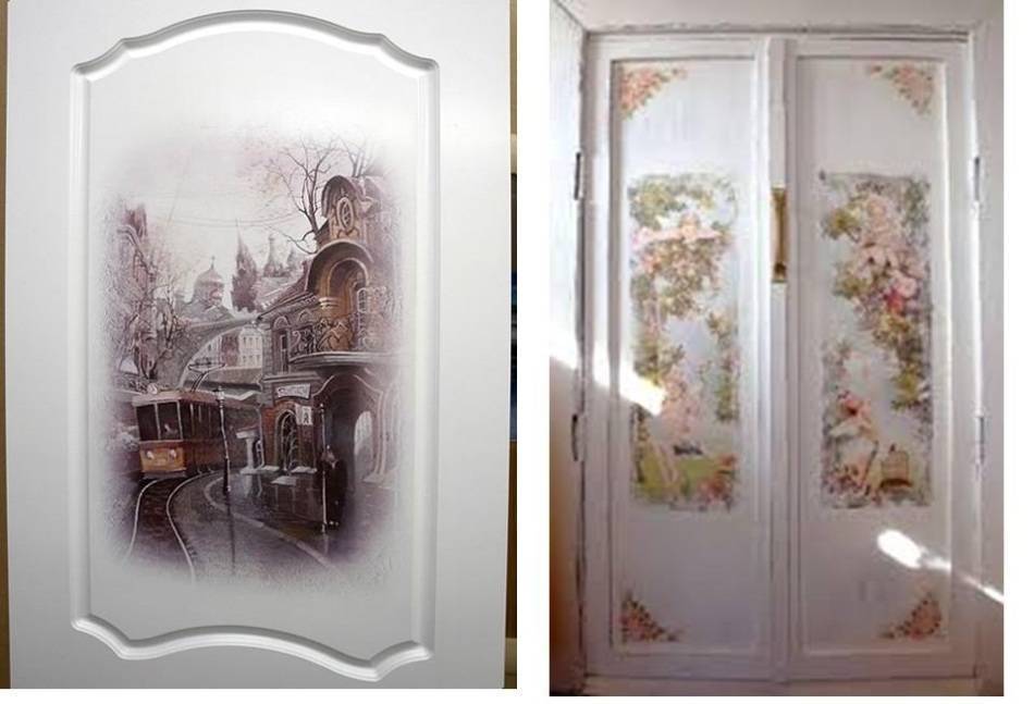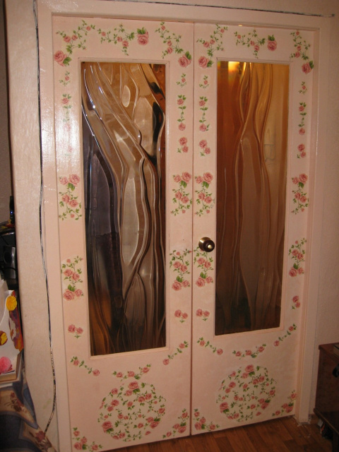 Очень интересная техника декора различного рода поверхностей – декупаж. Благодаря такому приему можно эффектно украсить дверь с помощью простой салфетки. Как это делается? Дверное полотно окрашивается в нужный цвет, желательно светлой гаммы, в идеале – белый. Берем трехслойную салфетку с понравившимся рисунком и вырезаем его ножничками, затем отделяем цветной слой и прикладываем к двери. В емкости разводим воду с клеем ПВА в соотношении примерно 5:1, пропорции могут изменяться в зависимости от густоты клея. Берем маленькую плоскую кисть с жестким ворсом и смачиваем в растворе.
