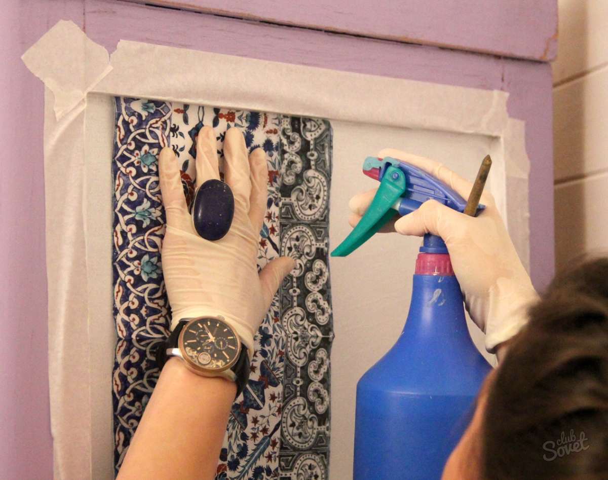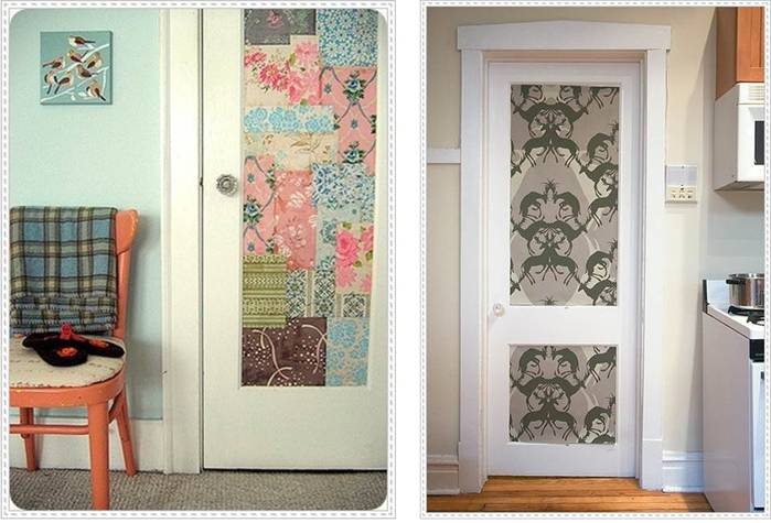 Перед оклеиванием двери тканью, обоями или фотообоями поверхность двери необходимо очистить, обезжирить растворителем и отшлифовать. Монтаж производится на клей ПВА. Небольшой нюанс: если вы обклеиваете дверь тканью, проверьте на небольшом куске ткани, чтобы клей не проступал.